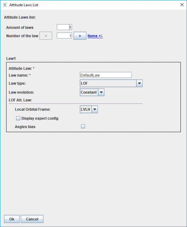 To define attitude laws, the [GENOPUS] widget is exactly the one used in [PSIMU] (on this example, a single attitude law which is defined as a LVLH one):